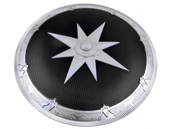 Komplet wykonany w całości z giętkiego, bezpiecznego plastiku w eleganckiej srebrno-czarnej kolorystyce. Idealny dla dzieci, ponieważ miecze są lekkie i puste w środku, co eliminuje ryzyko zrobienia krzywdy podczas zabawy. Tarcza ozdobiona jest herbem w postaci ośmioramiennej gwiazdy i posiada wygodną rękojeść od spodu, dzięki której można ją pewnie trzymać.