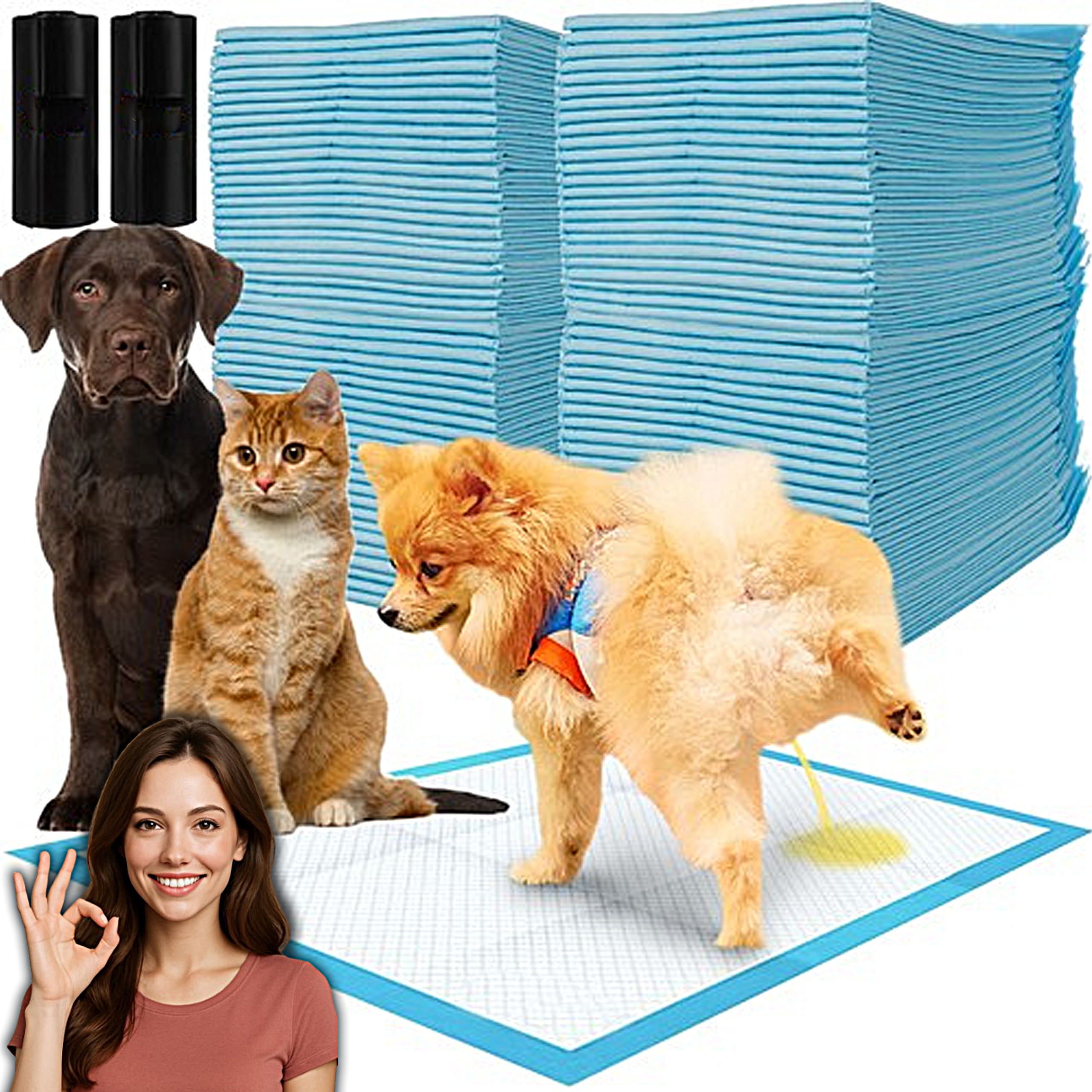 Praktyczny zestaw do higieny i codziennej opieki nad zwierzętami. Chłonne podkłady treningowe idealne do nauki czystości i dla zwierząt starszych lub schorowanych, a także w podróży, klatkach i transporterach. Dodatkowo w zestawie znajdują się mocne woreczki na psie odchody – niezbędne podczas spacerów. Kompleksowe rozwiązanie dla właścicieli psów, kotów i małych zwierząt.