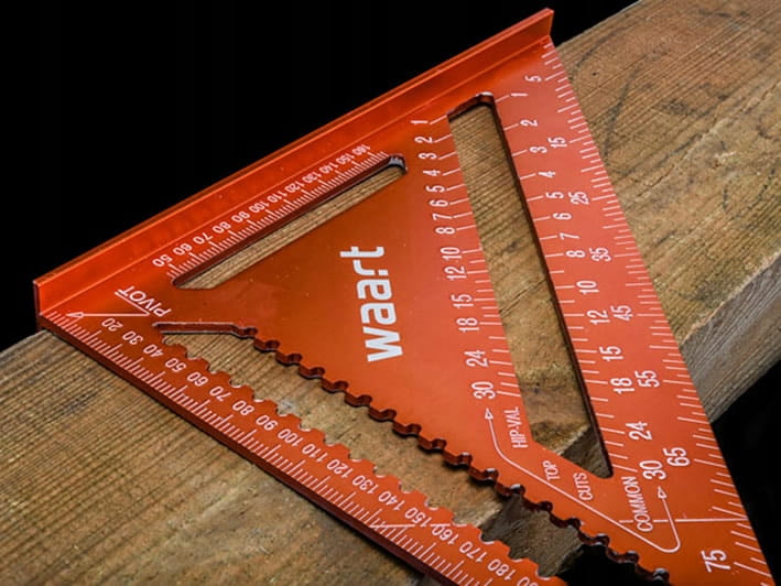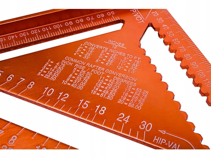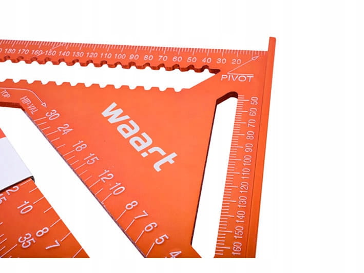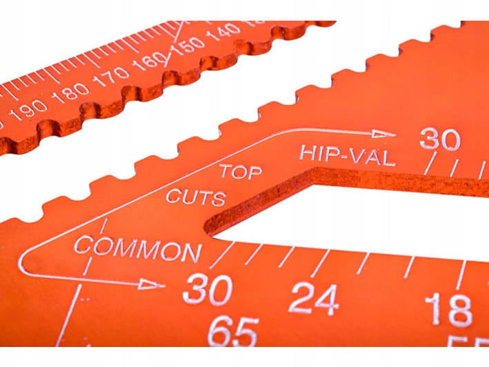 Kątownik dachowy, wykorzystywany przy budowie drewnianych konstrukcji dachu, prachach ciesielskich. Posiada oznaczenia pozwalające na docinanie m.in.. krokwi w więźbach dachowych. Szybko można wyznaczać kąt w zakresie 0 - 90 stopni, dodatkowo szybko i precyzyjnie można wyznaczać linię równoległe. Grawerowana podziałka, szeroka stopka na jednym z ramion. Podziałka - kątomierz na najdłuższym boku. Możliwość trasowania i szybkiego sprawdzania kąta 45 st. i 90 st. Kolor pomarańczowy, anodyzowany, odporny na działanie czynników zewnętrznych