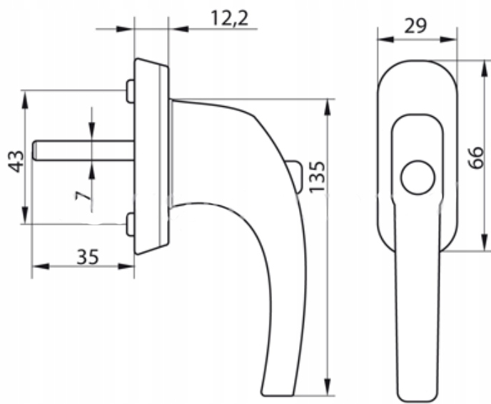 ✳️Klamka okienna magnezowa z przyciskiem – trzpień 35 mm, podstawa owalna