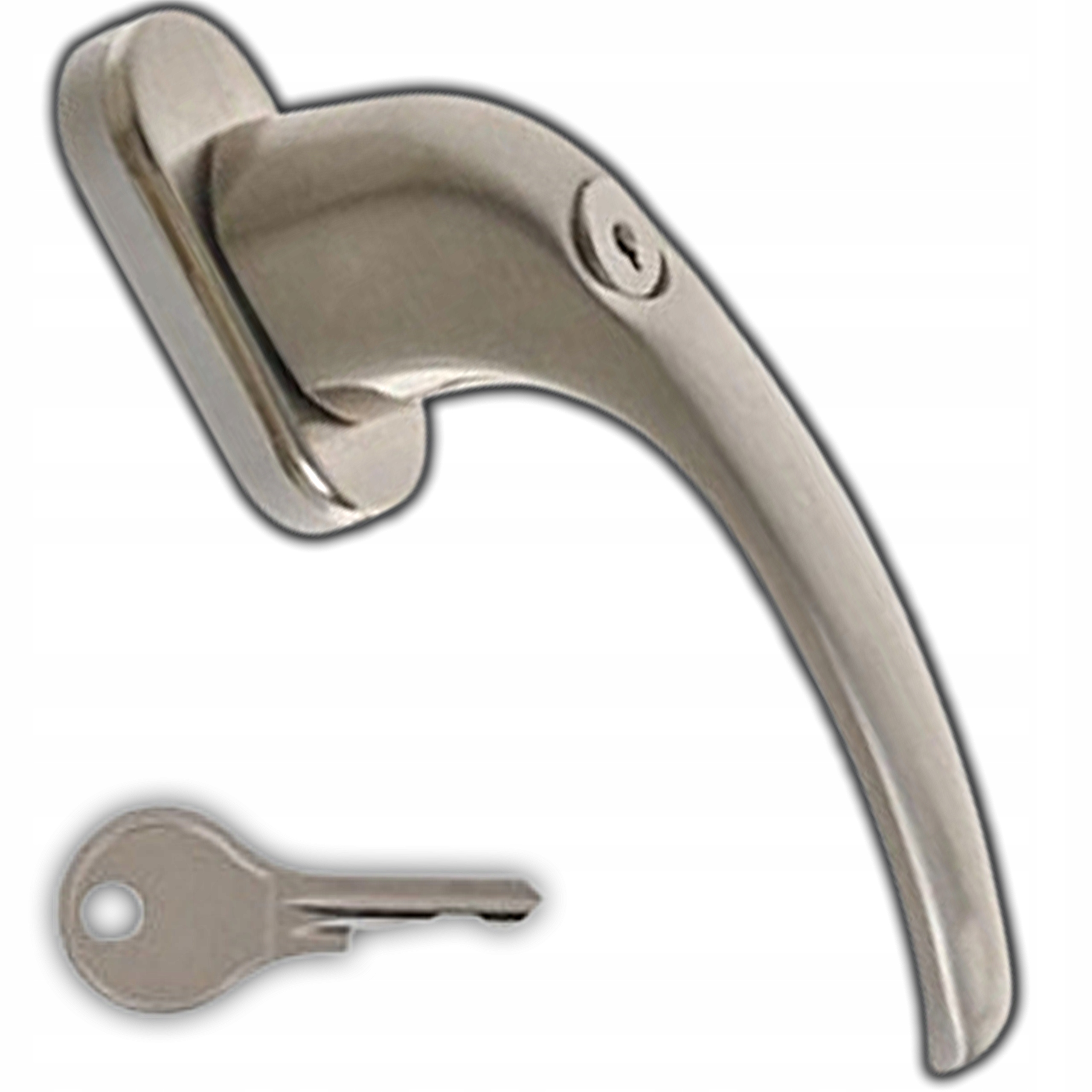 Nowoczesna klamka okienna z blokadą na klucz, wykończona w elegancznym kolorze stal nierdzewna. Dzięki zaokrąglonej, owalnej podstawie doskonale wpisuje się w nowoczesne aranżacje wnętrz, zapewniając jednocześnie wysoki poziom bezpieczeństwa.