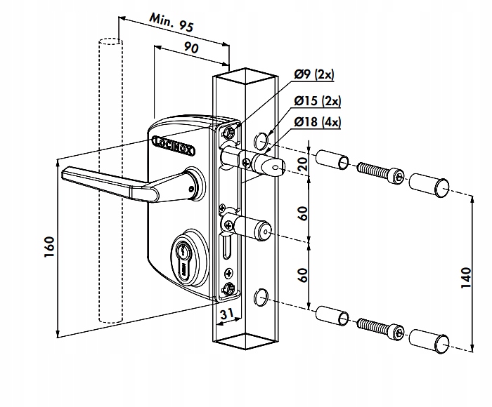 KLAMKA ZAMEK PRZEMYSŁOWY LOCINOX ALU OBUDOWA MECHANIZM INOX NA PROFIL 40x40