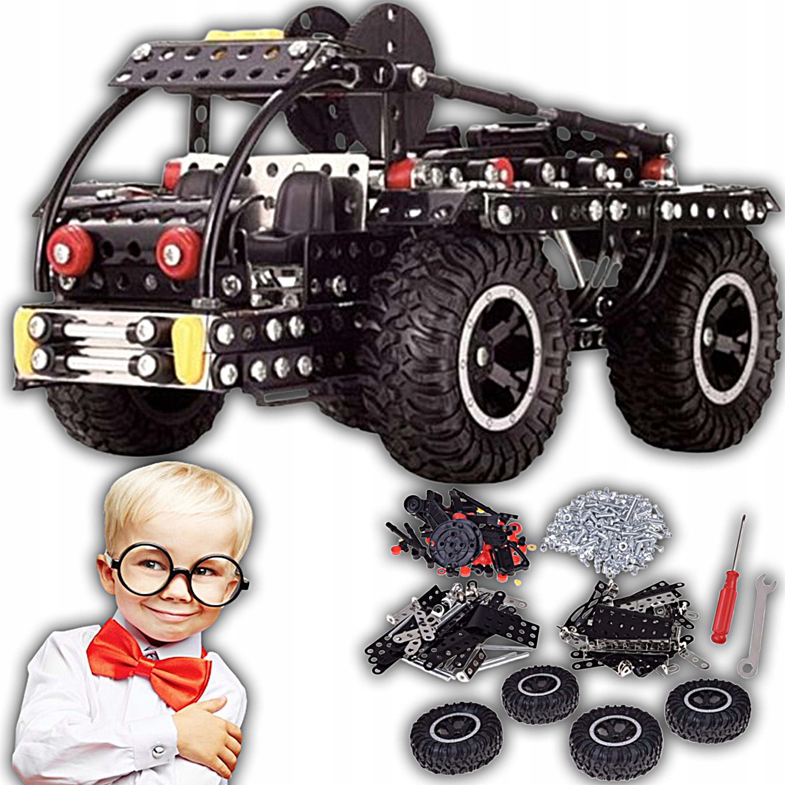 - Po złożeniu otrzymujesz realistyczny model terenowej ciężarówki z dużymi gumowymi kołami, reflektorami i solidną metalową konstrukcją. Wygląda jak prawdziwy pojazd off-roadowy – gotowy na każdą przygodę!