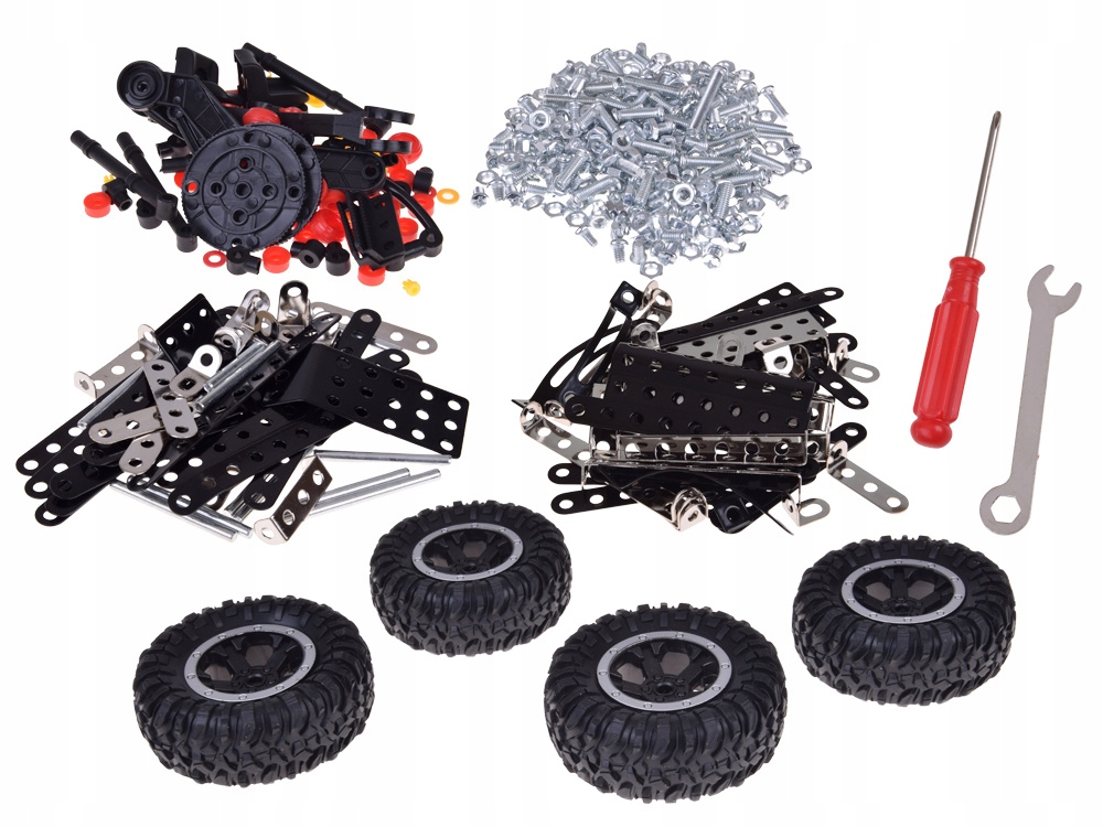 Zestaw składa się z 475 elementów, wśród których dominują metalowe części konstrukcyjne połączone z plastikowymi detalami i dużymi gumowymi kołami terenowymi, co sprawia, że gotowy model jest wyjątkowo stabilny, solidny i wygląda jak prawdziwy pojazd z off-roadowego świata.