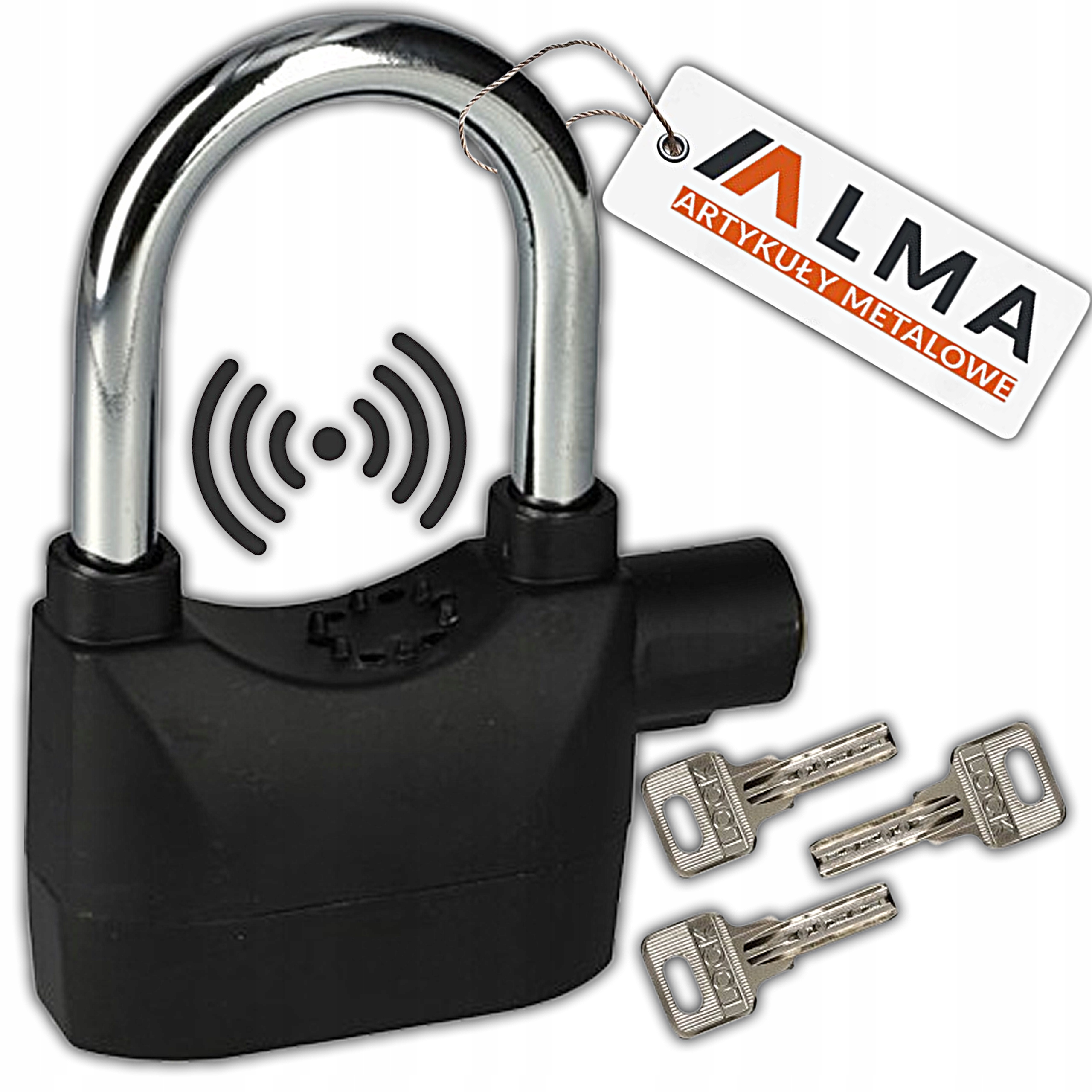 - Zawartość zestawu: kłódka z alarmem, 3 klucze, baterie LR44