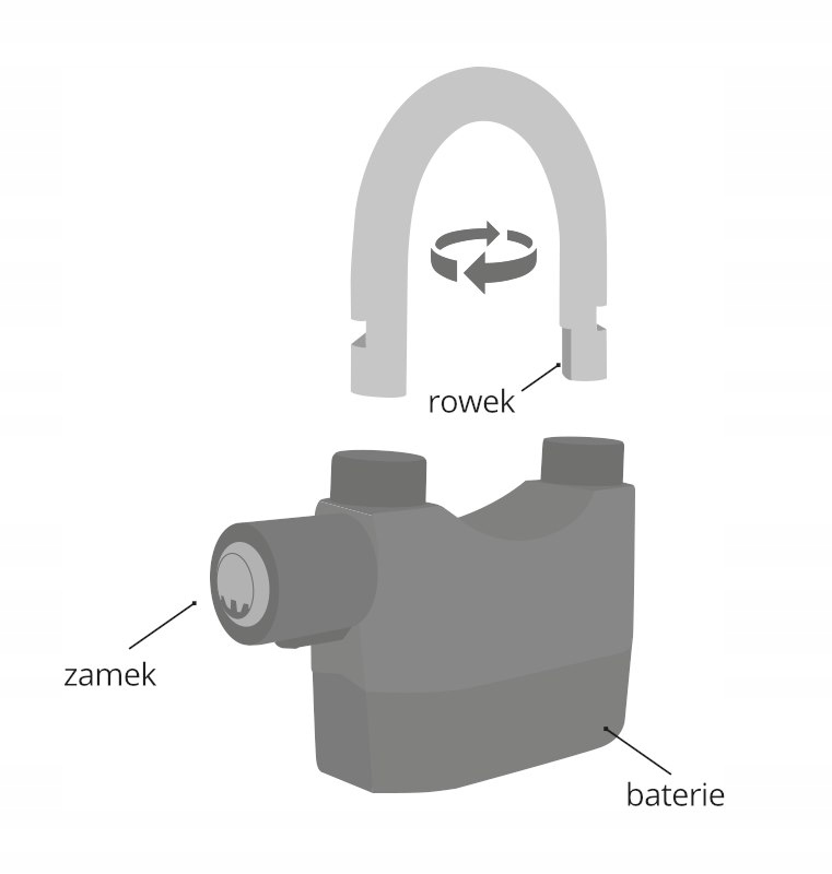- Długi, zdejmowany pałąk – szybkie i wygodne przypinanie.
