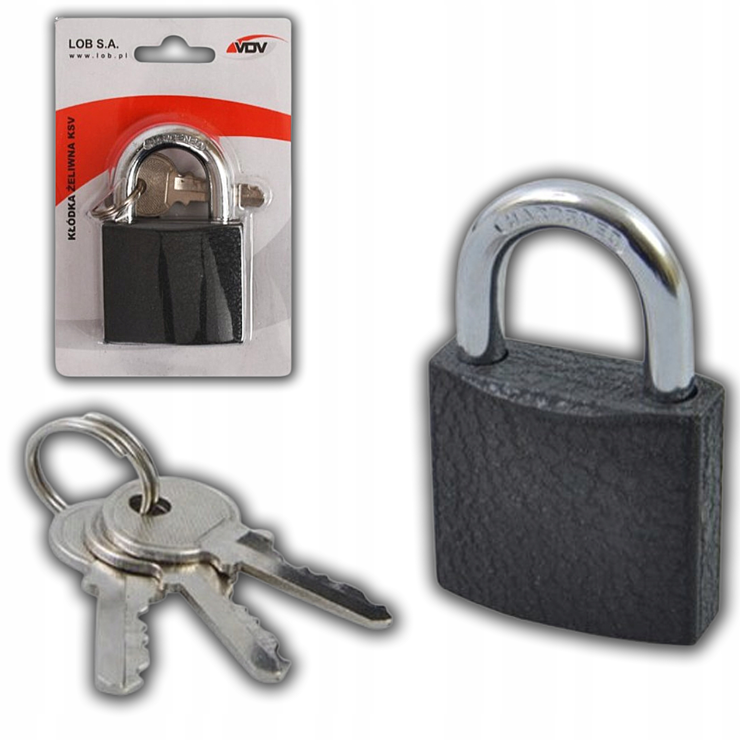 ✳️Kłódka żeliwna LOB KSV30 – zatrzaskowa, z hartowanym pałąkiem, blister