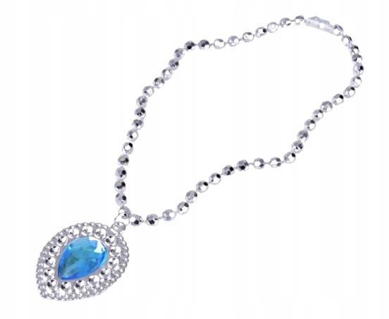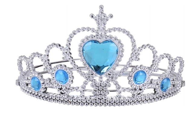 Zestaw uzupełnia przepiękna, błyszcząca biżuteria – srebrna korona z niebieskimi “diamentami oceanu”, kolczyki (klipsy), kolia oraz pierścień o symbolu lodowego serca.