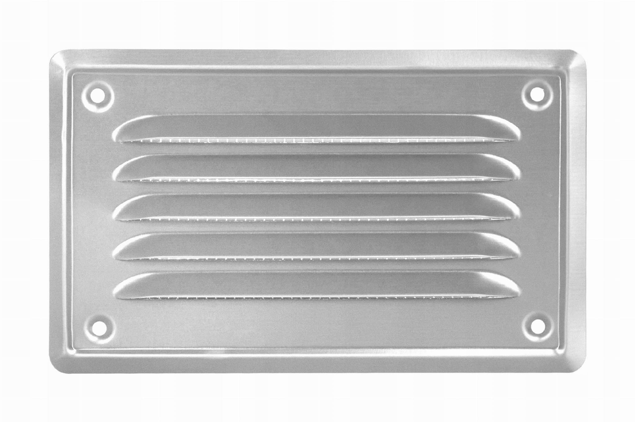 Metalowa płaska kratka ze skośnymi żeberkami oraz siatką.