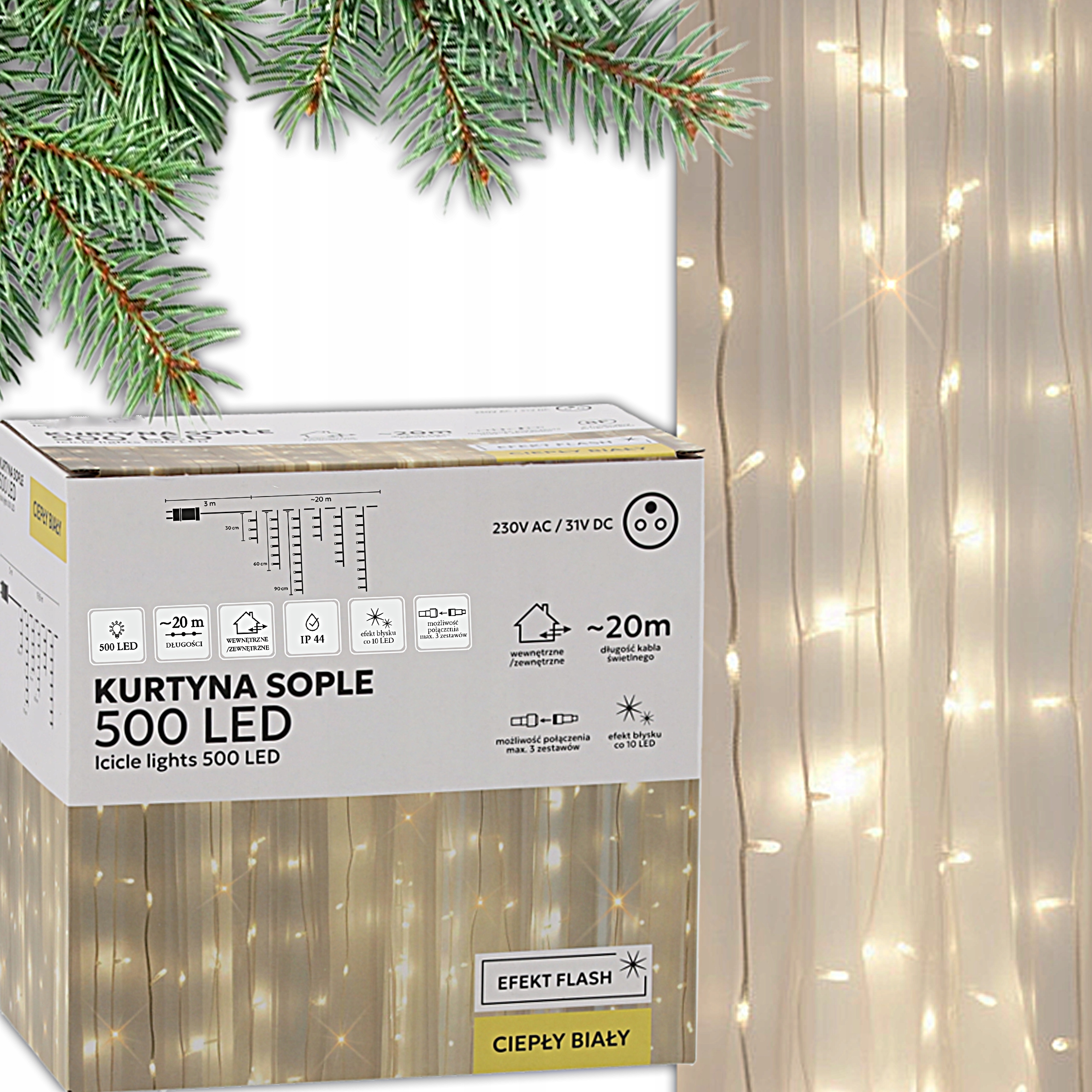 Zestaw zawiera aż 500 diod LED rozmieszczonych na 100 soplach o długościach 30/40/60/70 cm, co pozwala uzyskać efekt naturalnie opadających lodowych sopli. Długość całkowita 23 m (w tym 20 m części świetlnej) sprawia, że lampki świetnie nadają się do dekoracji elewacji, balkonów, ogrodzeń oraz większych choinek.