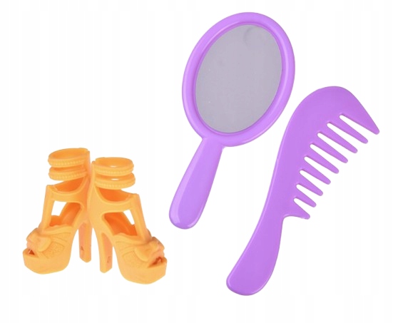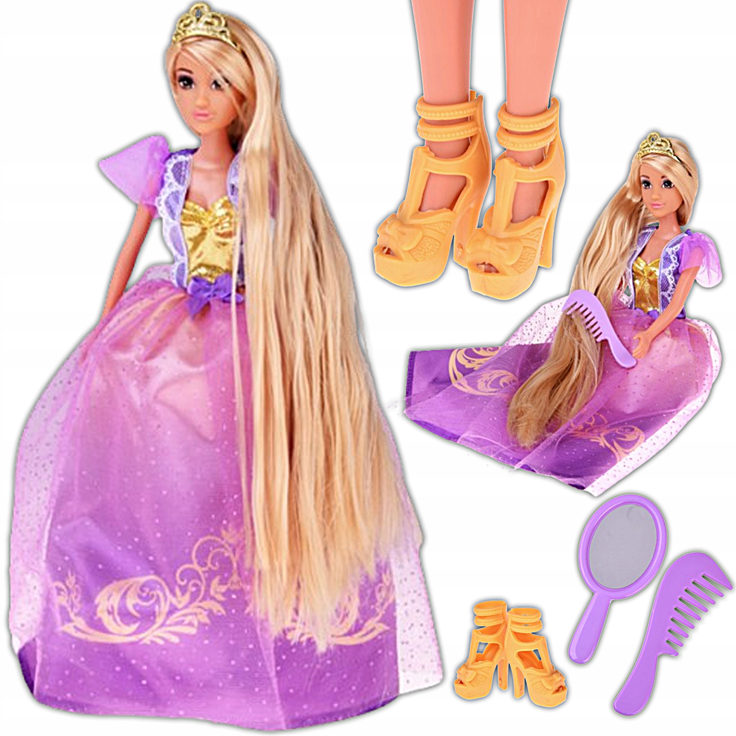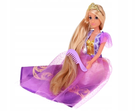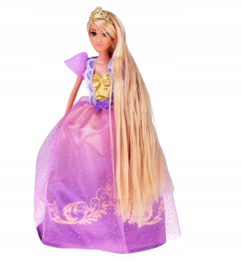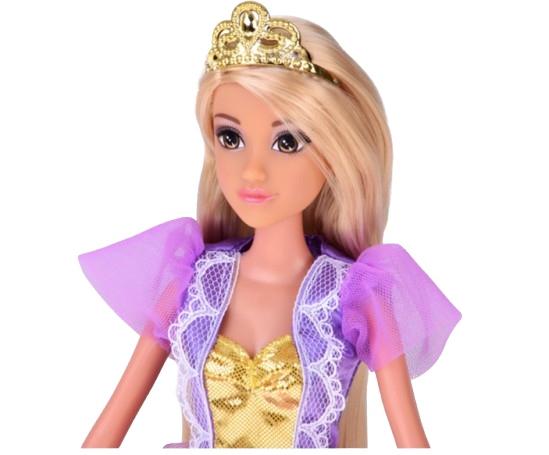 Księżniczka ubrana jest w balową suknię w odcieniach fioletu i złota, ozdobioną błyszczącymi elementami, które sprawiają, że wygląda jak prawdziwa gwiazda królewskiego balu. Na jej głowie znajduje się złota tiara, a w zestawie dołączono lusterko i grzebień – idealne do czesania i stylizowania jej długich włosów.