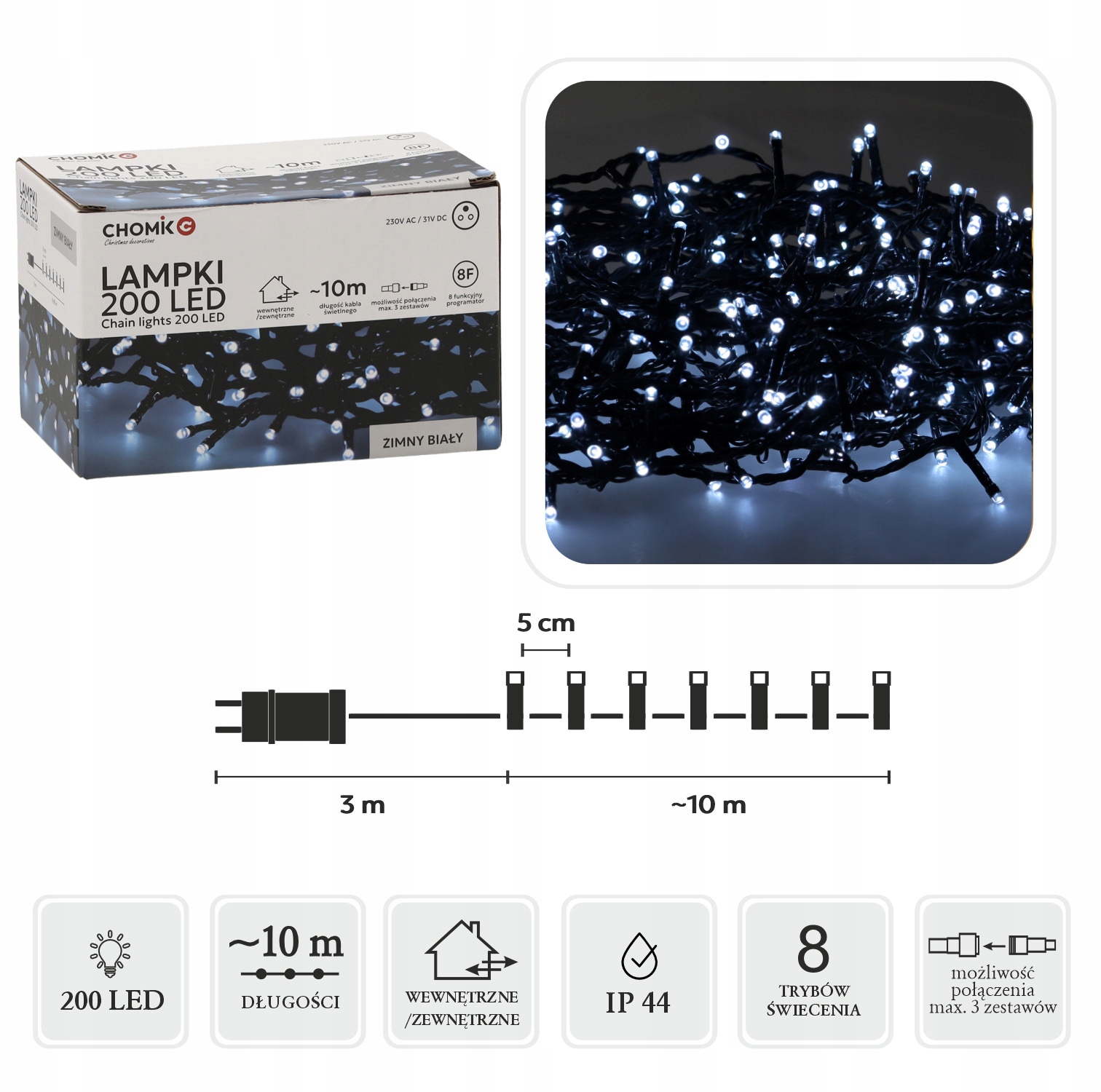 - Możliwość połączenia: Do 3 zestawów (łatwe wydłużenie łańcucha świetlnego)