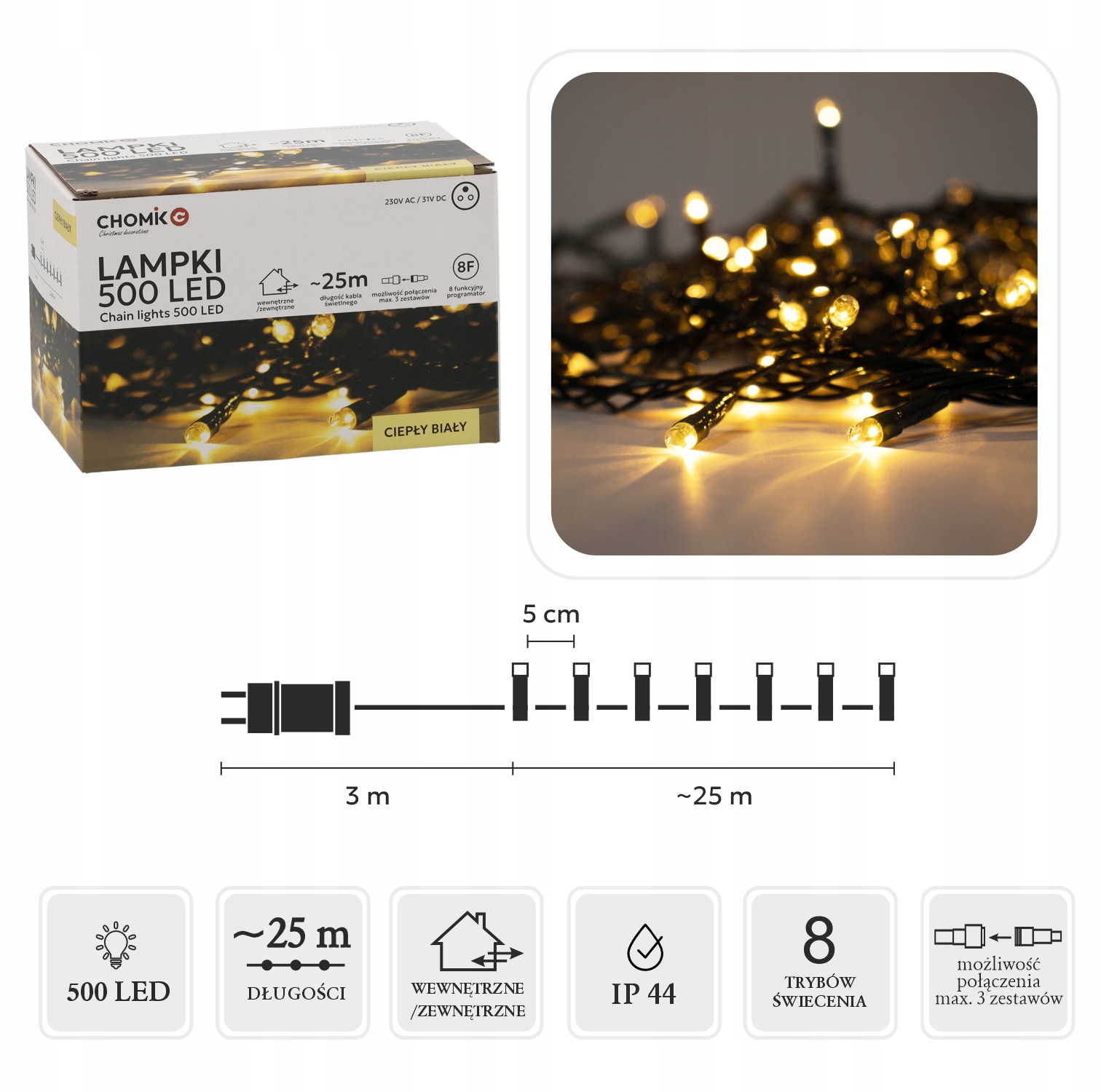 - Możliwość połączenia: Do 3 zestawów (łatwe wydłużenie łańcucha świetlnego)