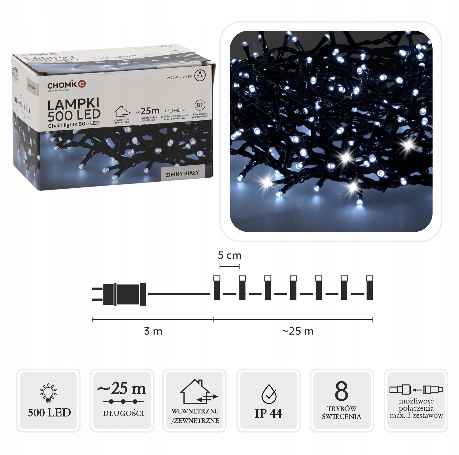 - Możliwość połączenia: Do 3 zestawów (łatwe wydłużenie łańcucha świetlnego)