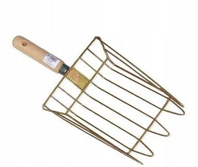 Szufelka do warzyw wykonana z drutu posiadająca drewniany uchwyt. Ażurowa budowa pozwala na oddzielenie warzyw od ziemi czy piasku.