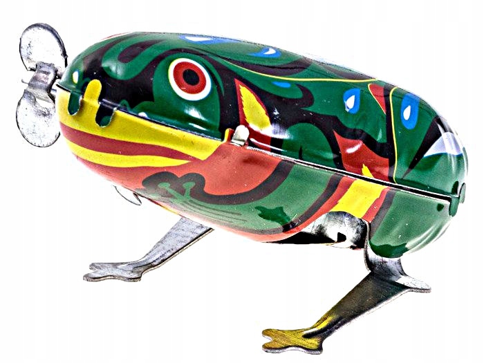 Wykonana z metalu, w charakterystycznym zielonym kolorze, działa dzięki sprężynowemu mechanizmowi nakręcanemu kluczykiem. Po nakręceniu blaszana żabka zaczyna poruszać się w zabawny sposób, dokładnie tak, jak w klasycznych zabawkach sprzed lat.