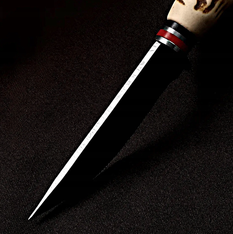 Charakterystyczna rękojeść stylizowana na poroże dzikiej zwierzyny zapewnia nie tylko efektowny wygląd, ale również bardzo pewny i wygodny chwyt. Ergonomiczny kształt sprawia, że nóż stabilnie leży w dłoni nawet przy intensywnym użytkowaniu.