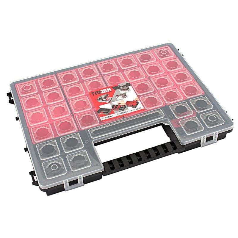 Organizer Tandem C 400 wyposażony jest w łączenia dwóch takich samych produktów w jedną walizkę. Organizer w wewnątrz posiada przegrody które dodatkowo wyposażone są w małe pojemniki na śrubki, gwoździki, zszywki i inne drobiazgi, które można pojedynczo wyjmować. Kolorowe wyjomowane pojemniki ułątwiają pracę. Organizer będzie przydatny w samochodzie, warsztacie, domu, na rybach.