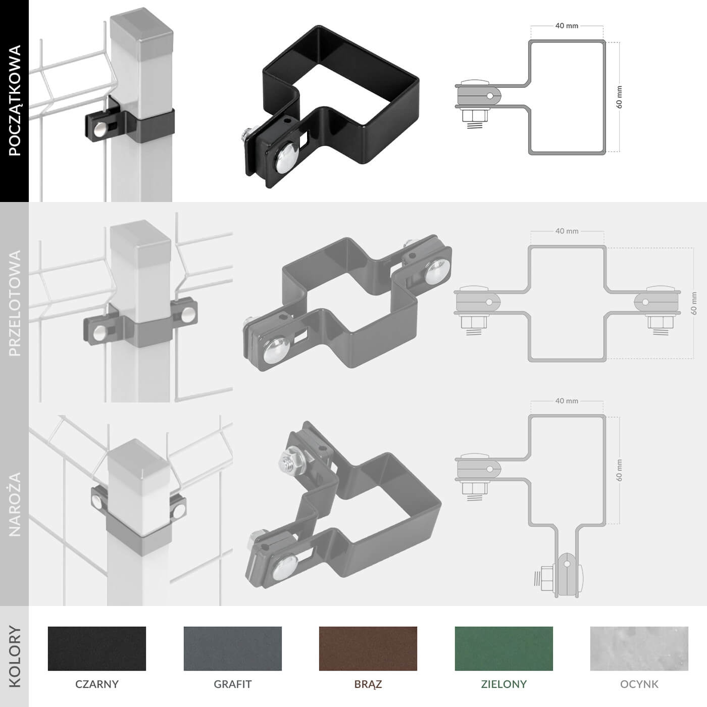 Obejma słupka POCZĄTKOWA 60x40 - CZARNA do paneli ogrodzeniowych