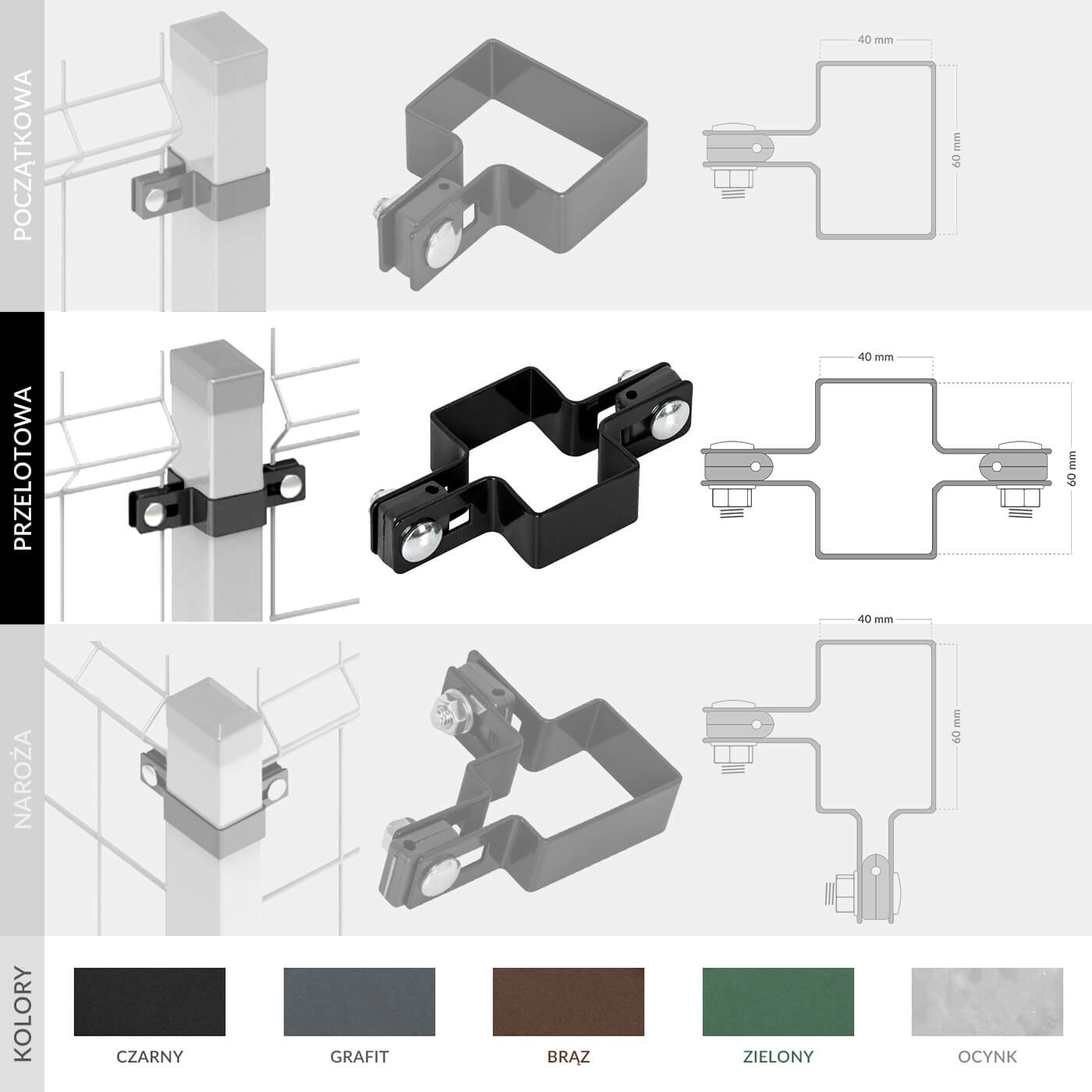 Obejma słupka PRZELOTOWA 60x40 - BRĄZ do paneli ogrodzeniowych