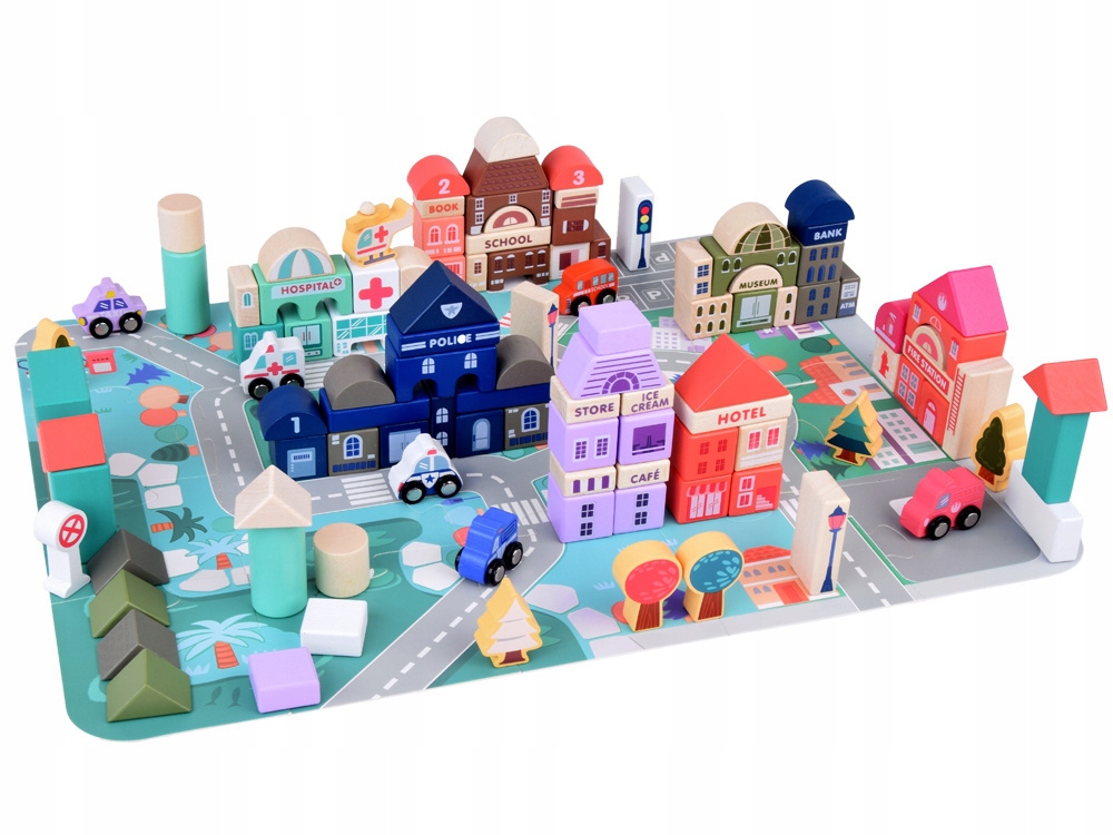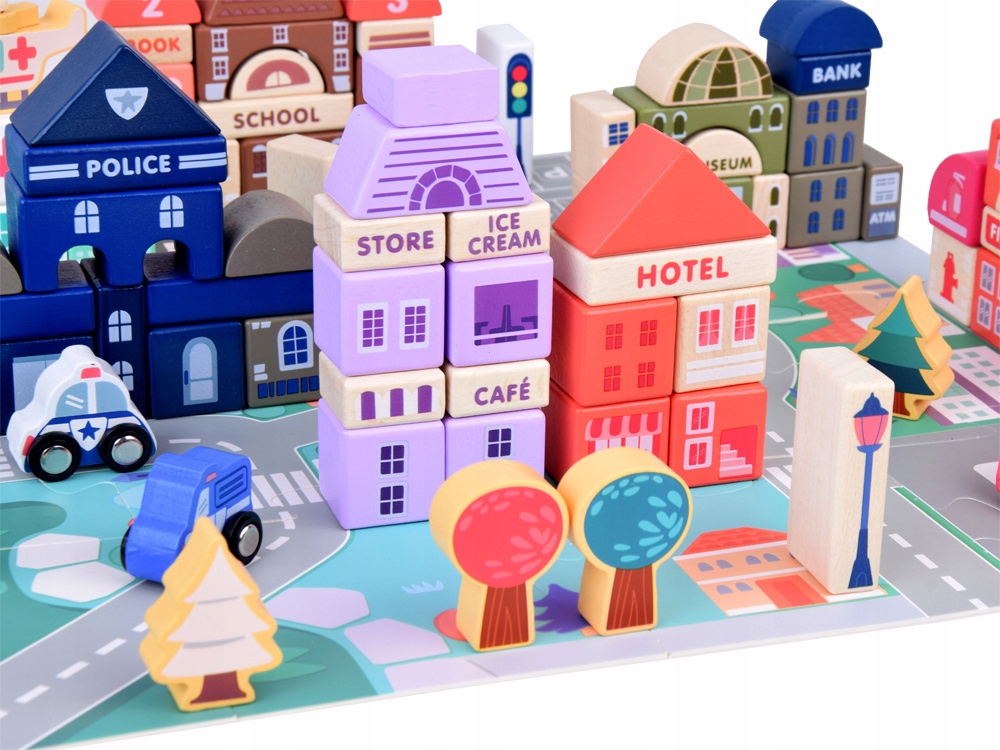 PASTELOWY ZESTAW KLOCKI DREWNIANE MIASTECZKO + MATA PUZZLE 115 ELEMENTY