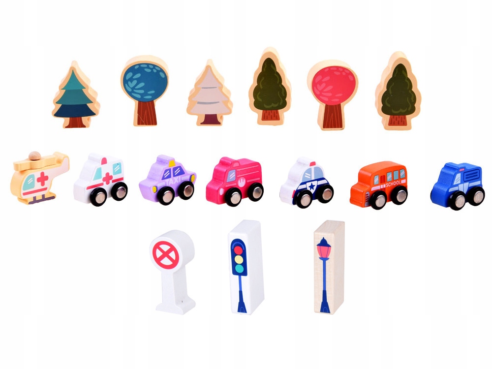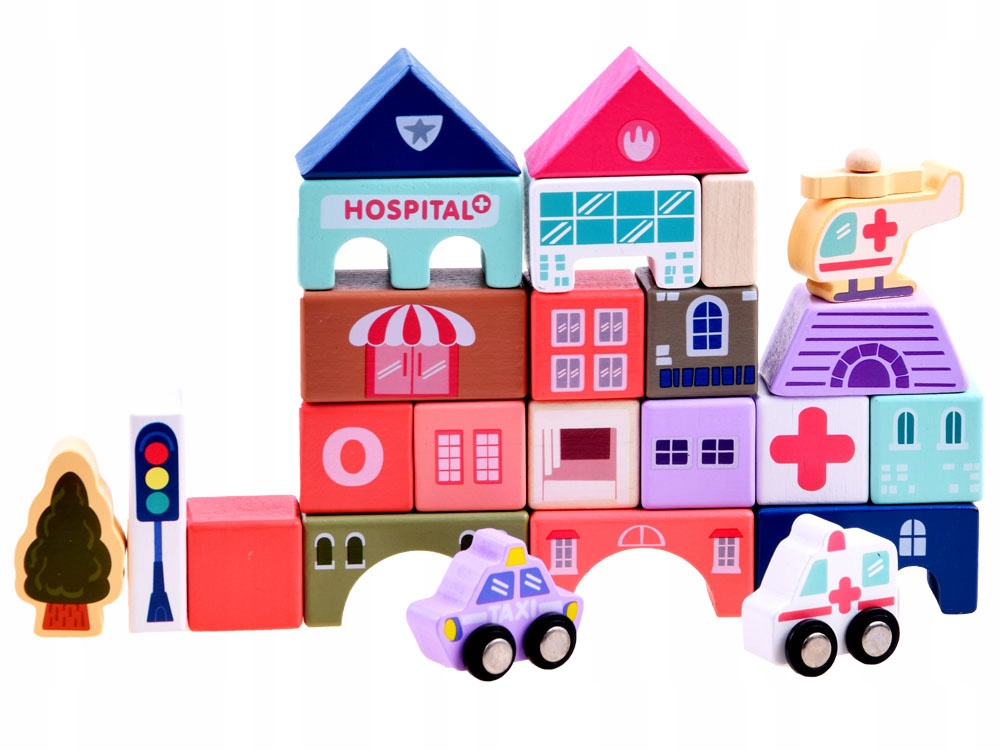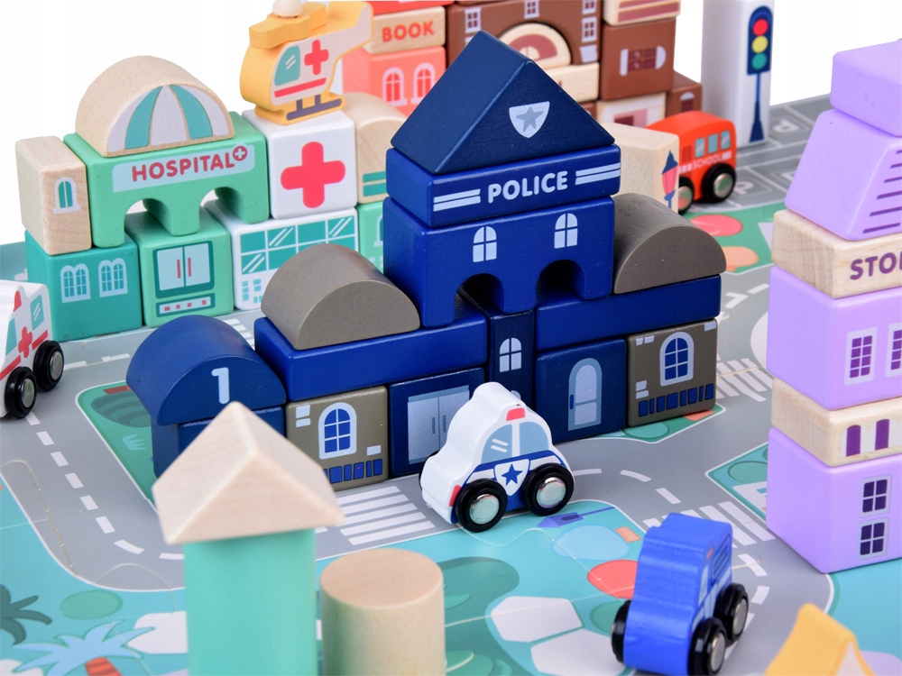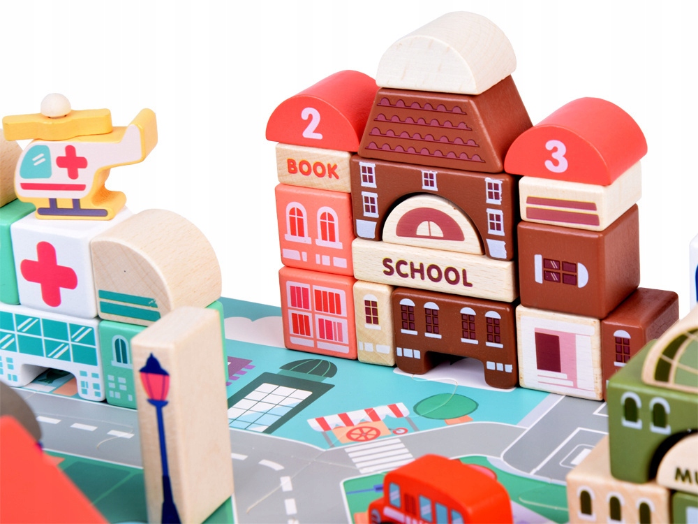 Każdy element został starannie pomalowany bezpieczną farbą dla dzieci. Wiele klocków posiada precyzyjne rysunki, napisy i literki, co czyni je atrakcyjnymi wizualnie dla dzieci i dorosłych.