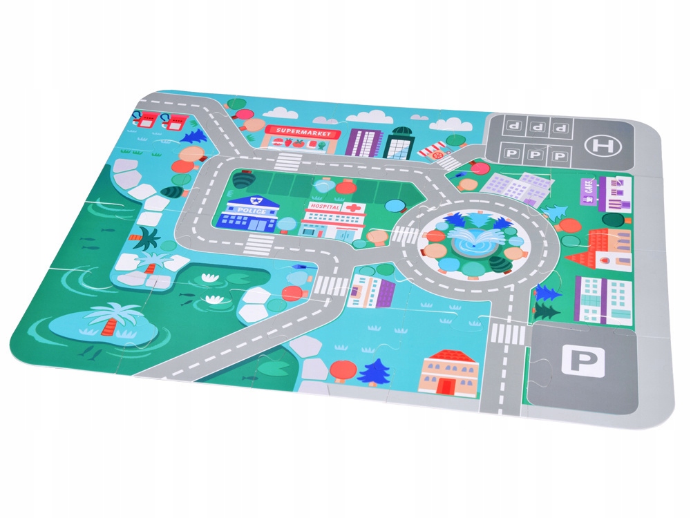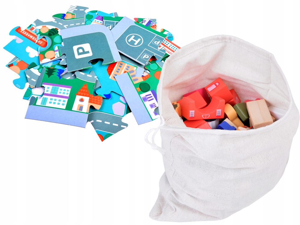 Przed zabawą warto ułożyć puzzle przedstawiające miasteczko, które pokazują miejsca pod budowle, ulice, znaki drogowe do nauki jazdy oraz roślinność, tworząc pełną, interaktywną scenę. Po skończonej zabawie klocki można łatwo schować do dołączonego materiałowego worka, co ułatwia utrzymanie porządku.
