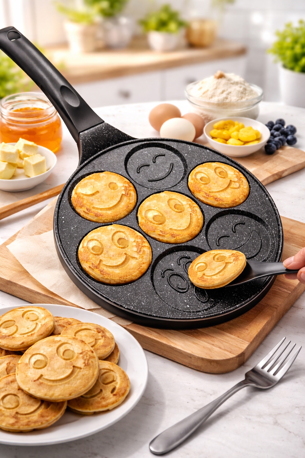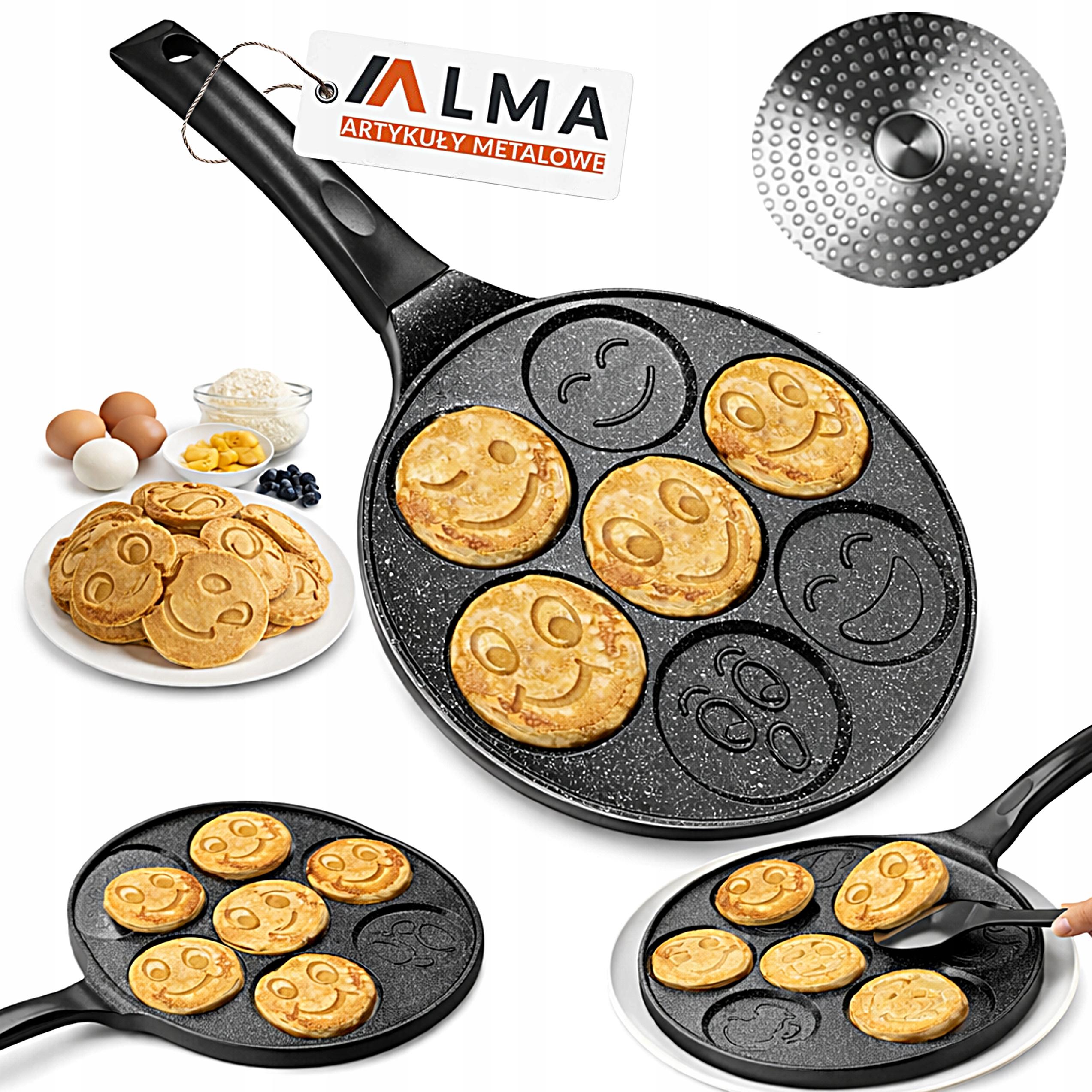 Wzory emotek w każdej z siedmiu komór nadają potrawom atrakcyjny wygląd, co może zachęcić dzieci do jedzenia oraz urozmaicić codzienne posiłki. Grube dno stabilizuje temperaturę podczas smażenia, a odkręcany uchwyt ułatwia przechowywanie i mycie. Patelnia stanowi praktyczne rozwiązanie do przygotowywania śniadań i przekąsek w domu.