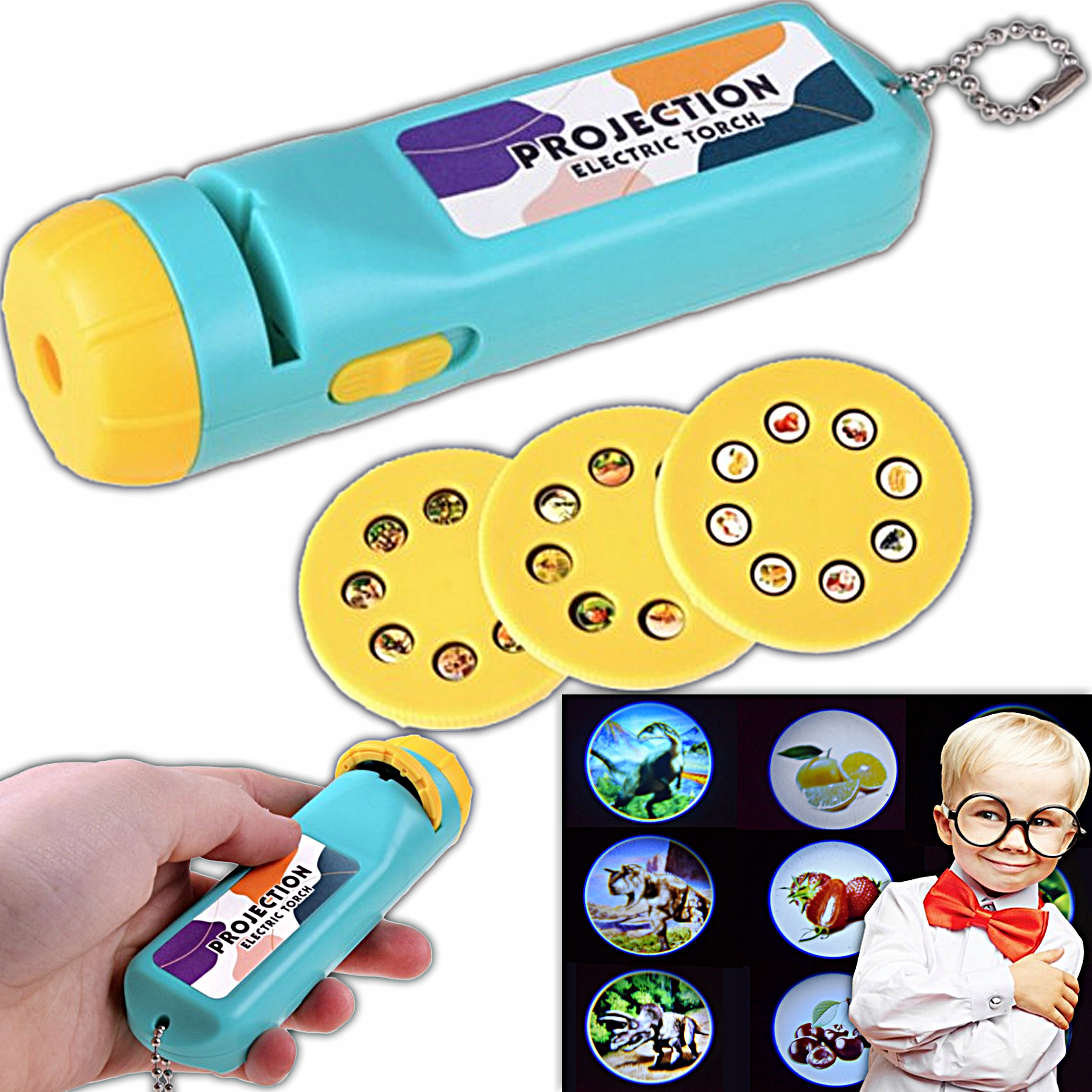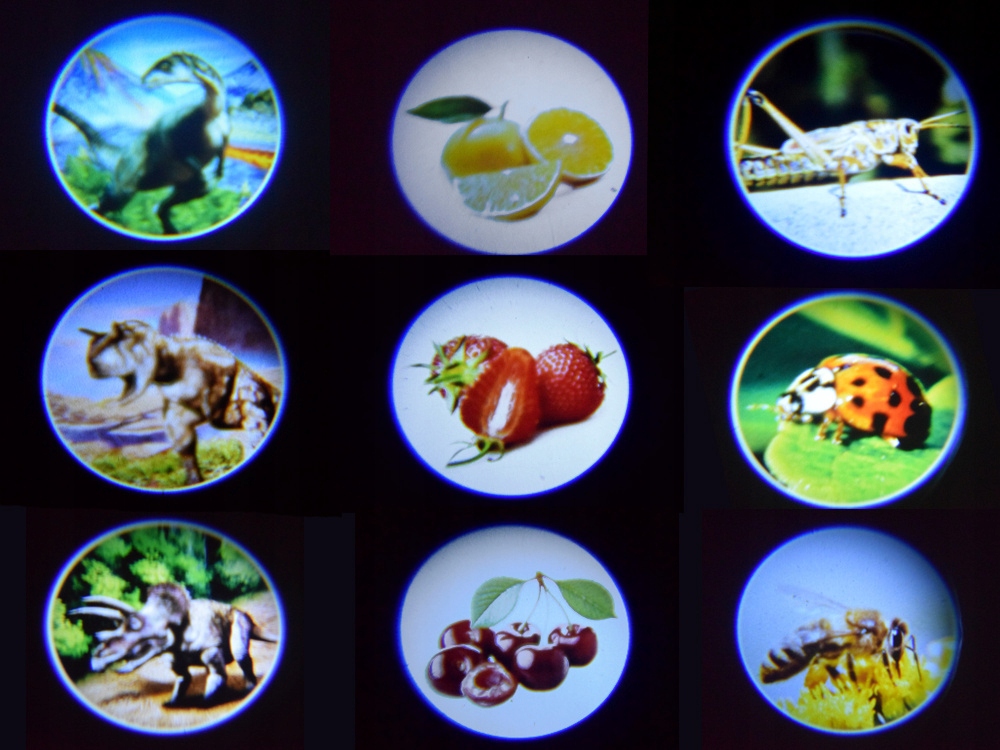 Ręczny projektor wyposażony został w 3 wymienne tarcze ze slajdami, co sprawia, że zabawka długo pozostaje atrakcyjna. Każda tarcza zawiera 8 innych obrazków, tworząc aż 24 różne projekcje do oglądania. A gdy slajdy nie są założone, projektor działa jak latarka – doskonała do oświetlania ciemnych zakamarków pokoju.