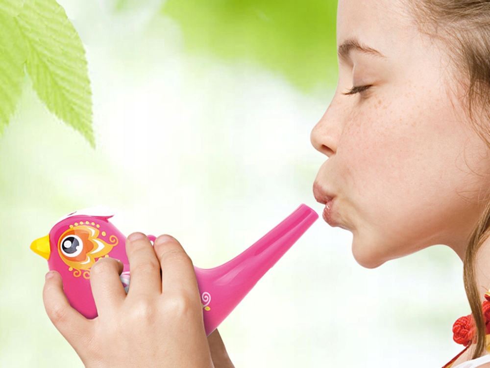 Dmuchając w pusty gwizdek, dziecko usłyszy czysty, donośny ton. Po nalaniu wody przez otwór znajdujący się na główce, ptaszek zaczyna wydawać melodię przypominającą delikatne, anielskie ćwierkanie.