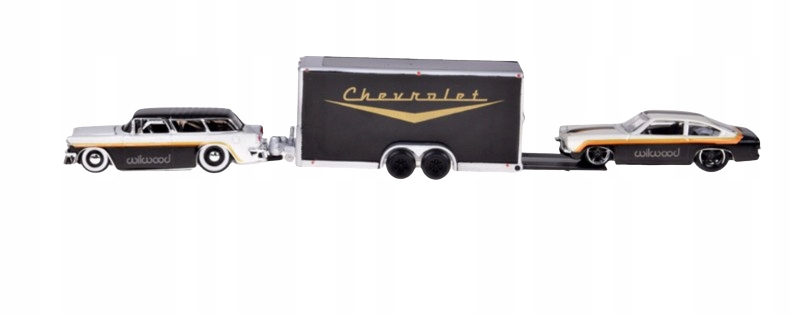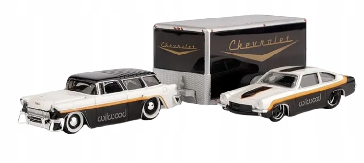 Modele są w eleganckiej biało-czarnej kolorystyce, która nadaje im klasyczny i ponadczasowy wygląd. Chevrolet Nomad 1955 wyposażono w hak, który umożliwia przyczepienie do zestawu dołączonej przyczepki. Hak można zdemontować przy użyciu śrubki, a przyczepkę można również odczepić bez konieczności odkręcania haka. Chevrolet Vega 1971 idealnie mieści się na przyczepce, dzięki czemu zestaw zyskuje dodatkową funkcjonalność i atrakcyjny element zabawy lub ekspozycji.