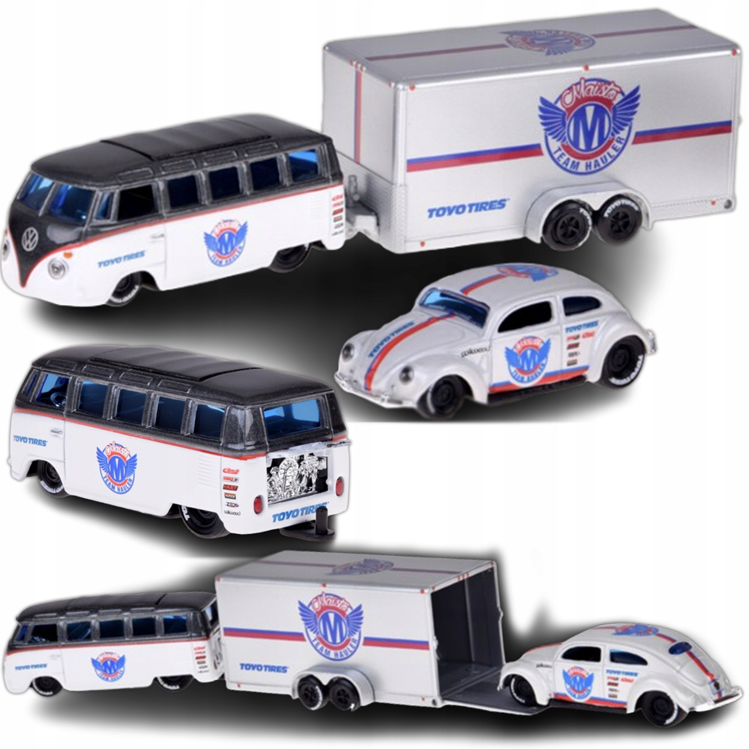 Modele utrzymano w eleganckiej biało-srebrnej kolorystyce, która nadaje im klasyczny i ponadczasowy wygląd. Volkswagen Van „Samba” wyposażono w hak, umożliwiający przyczepienie do zestawu dołączonej srebrnej przyczepki. Hak można zdemontować przy użyciu śrubki, a przyczepkę można odczepić również bez konieczności odkręcania haka. Volkswagen Beetle idealnie mieści się na przyczepce, dzięki czemu zestaw zyskuje dodatkową funkcjonalność i atrakcyjny element zabawy lub ekspozycji.