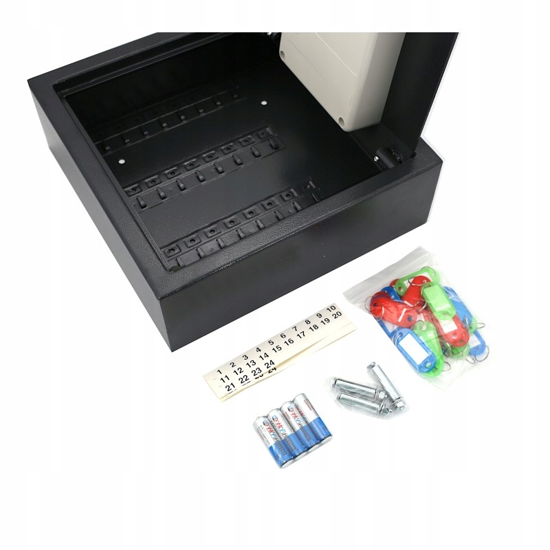 Szafka elektroniczna na 24szt kluczy.Szafka zawiera zawieszki na klucze oraz jest wyposażona w zamek szyfrowy z możliwością otwarcia kluczem. W komplecie znajdują się 4 baterie AA, instrukcja obsługi, dwa zapasowe klucze oraz kołki montażowe. Szafka jest wykonana z wytrzymałej stali o grubości 3mm, co zapewnia bezpieczeństwo przechowywanych kluczy.