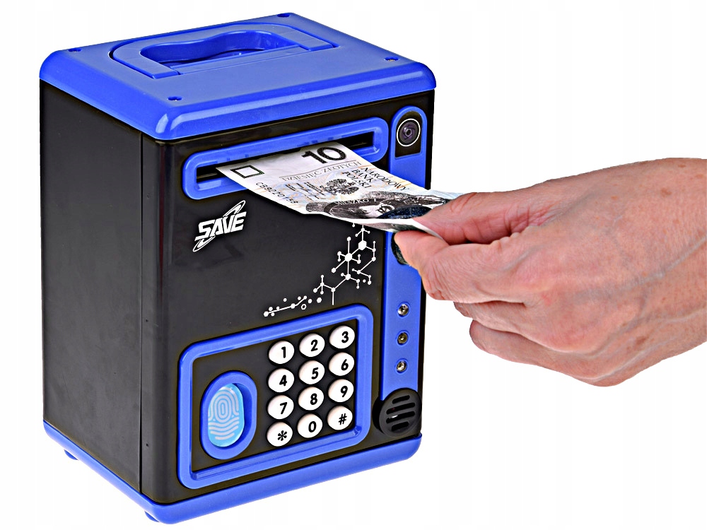 - Automatyczne wciąganie banknotów – wystarczy wsunąć banknot do slotu, a sejf sam go pobierze, czemu towarzyszy wesoła melodia.