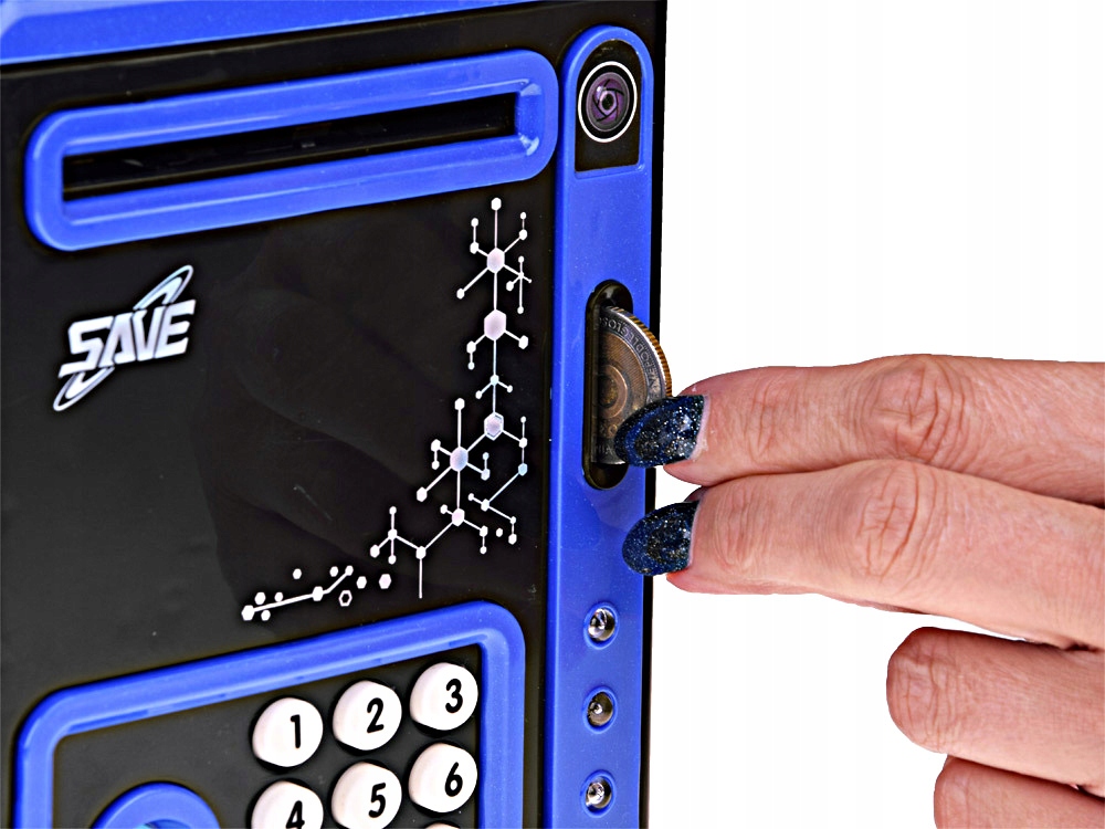 - Otwory na monety – z przodu oraz na górze sejfu znajduje się miejsce do wrzucania monet.