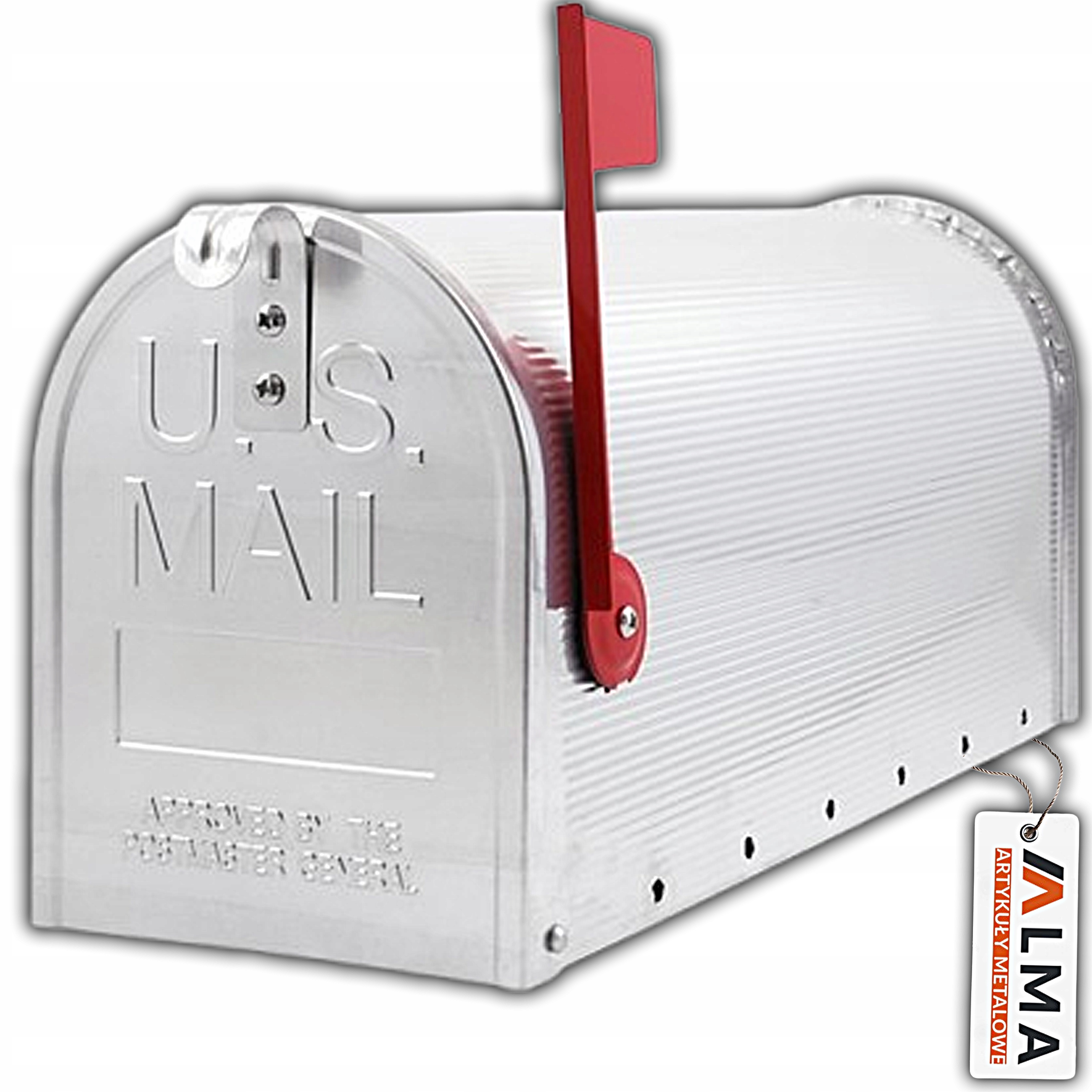 Klasyczna skrzynka pocztowa w stylu U.S. MAIL, wykonana z aluminium, odpornego na korozję i warunki atmosferyczne. Posiada charakterystyczną czerwoną flagę sygnalizacyjną oraz front z motywem koperty (bez orła). Zaokrąglona górna część i głębokość 48 cm pozwalają wygodnie przechowywać listy, ulotki i drobne koperty. Model sprawdza się przy furtkach, na ogrodzeniach, słupkach i elewacjach, łącząc estetykę ze funkcjonalnością.