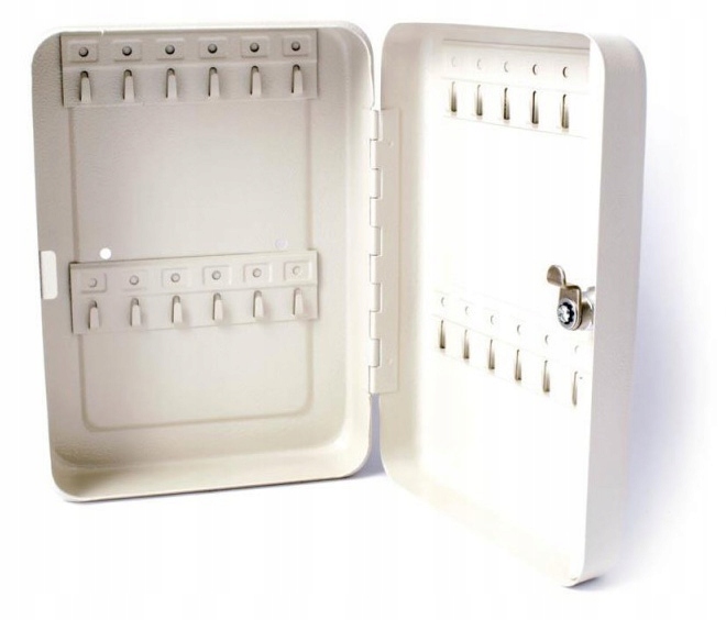 Metalowa szafka na klucze z 24 haczykami, zamykana na klucz.