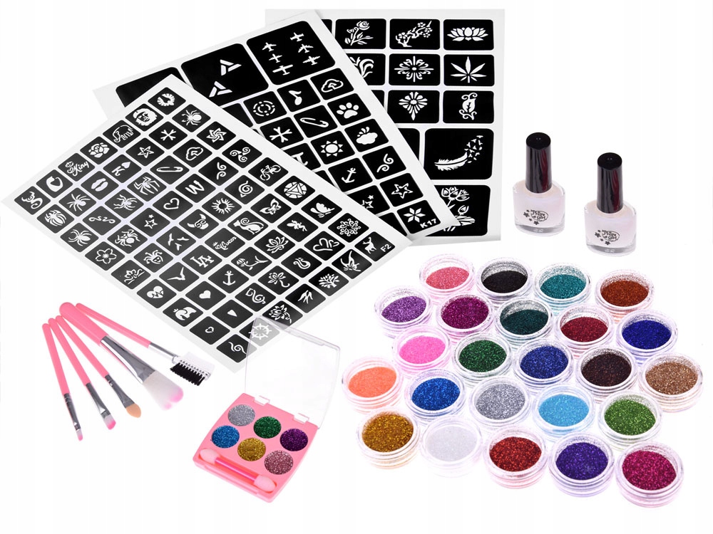 TATUAŻE BROKATOWE DUŻY ZESTAW DO ROBIENIA TATUAŻY 24 KOLORY 120 WZORY