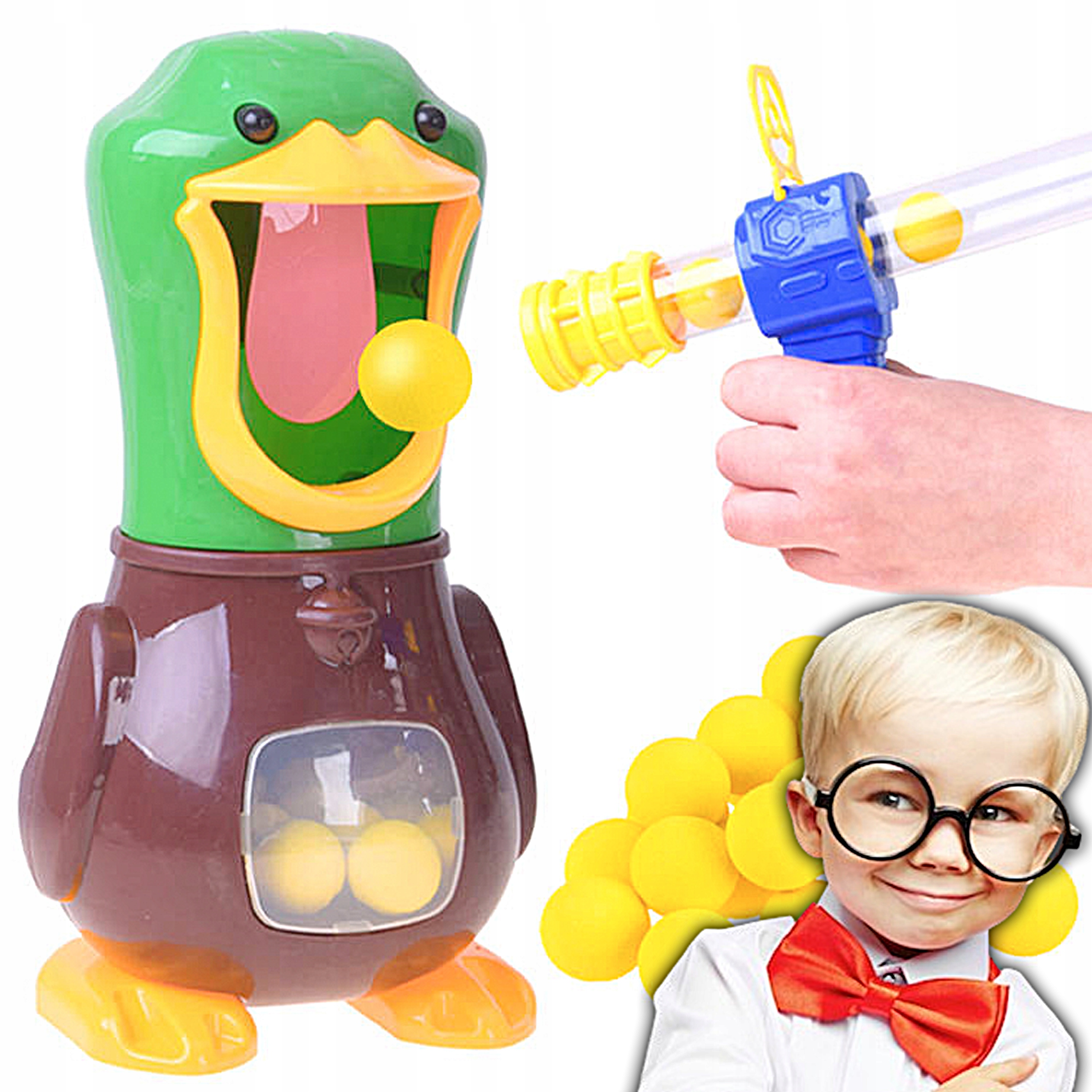 Zabawka jest bezpieczna, lekka i bardzo prosta w obsłudze – wystarczy załadować kulkę, nacisnąć pompkę i celować w otwarty dziób kaczki.