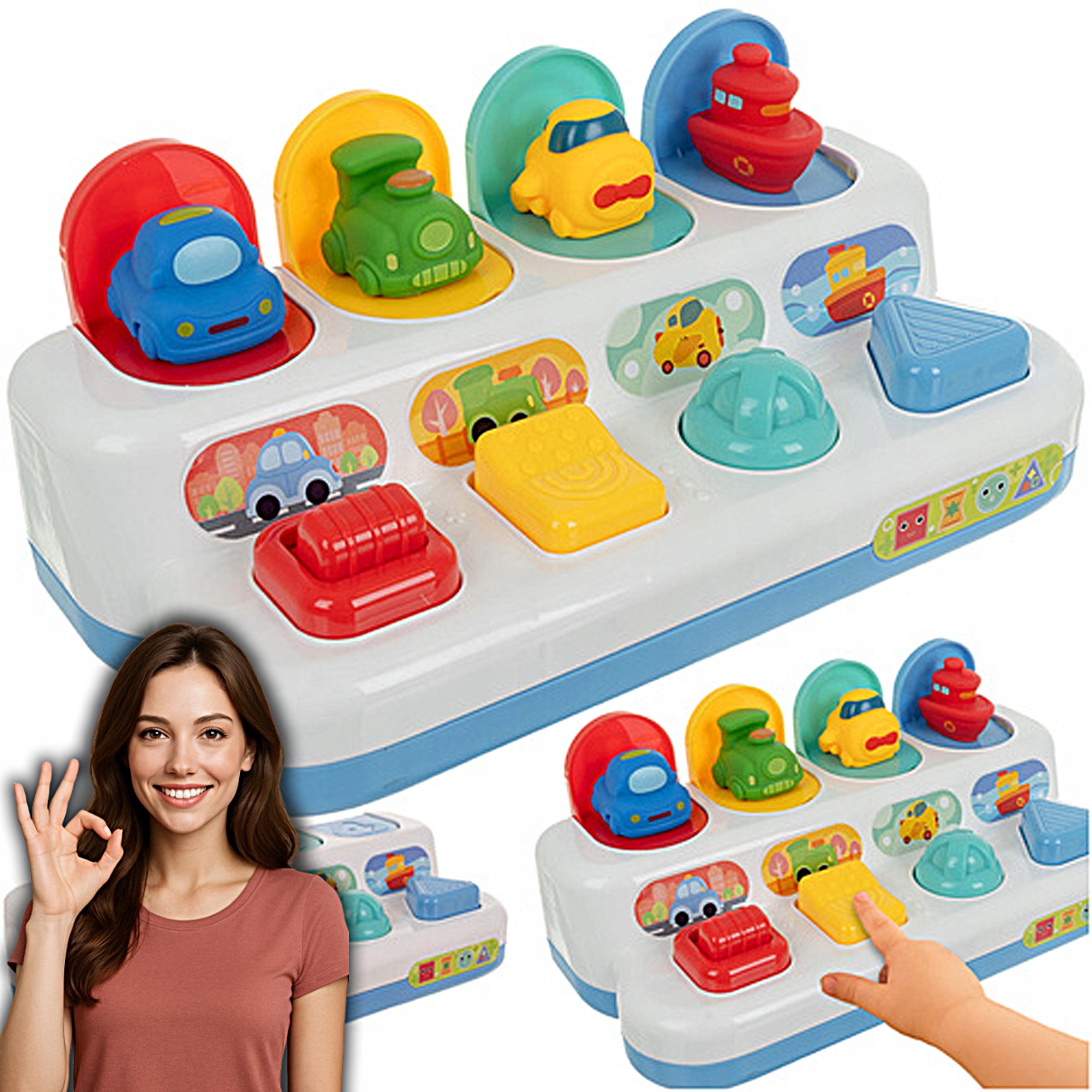 ZABAWKA EDUKACYJNA WYSKAKUJĄCE POJAZDY AUTKA INTERAKTYWNE DLA DZIECI 18m+