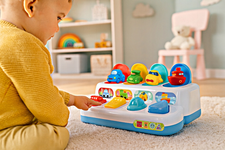 Naciskanie przycisków, pokręteł i dźwigni oraz obserwacja wyskakujących pojazdów wspiera rozwój motoryki małej, koncentracji i umiejętności przyczynowo–skutkowego myślenia.