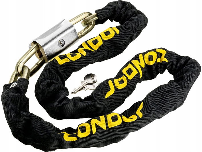 Mocny, solidny łańcuch wykonany jest z wysokiej jakości hartowanej stali. W celu zwiększenia wytrzymałości w łańcuchu zastosowano ogniwa o przekroju czworokątnym, grubości 10mm. Pancerny zamek jest hartowany, zaś jego konstrukcja zabezpiecza przed próbami podważenia i rozwiercenia zamka. Łańcuch został pokryty estetycznym i odpornym na działanie warunków atmosferycznych materiałem, zabezpieczającym dodatkowo rower przed porysowaniem. Długość 120cm pozwala na swobodne zabezpieczenie roweru.