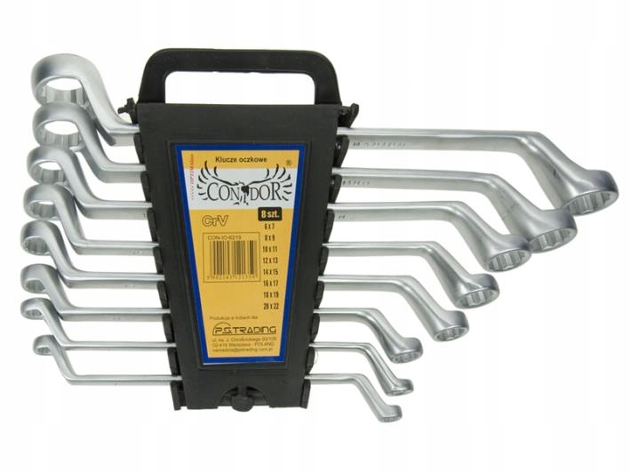Zestaw kluczy oczkowych głęboko osadzonych wykonany z wysokiej jakości stali chromowo wanadowej. Powierzchnia kluczy satynowa. Odgięcie (odsadzenie) klucza zapewnia ułatwienie pracy w ciężko dostępnych miejscach.
