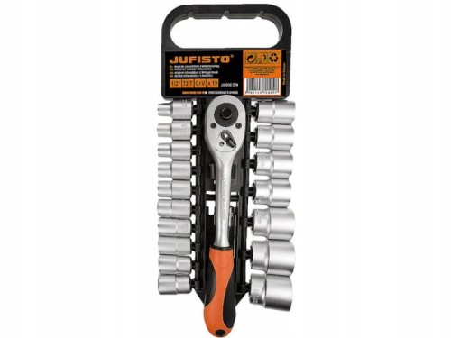 Składa się z 19 elementów umieszczonych na praktycznym wieszaku z tworzywa sztucznego. Uzupełnieniem zestawu jest grzechotka 1/2" z trwałym mechanizmem zapadkowym o 72 zębach, wyposażona w ergonomiczny, profilowany uchwyt, zapewniający komfort pracy.